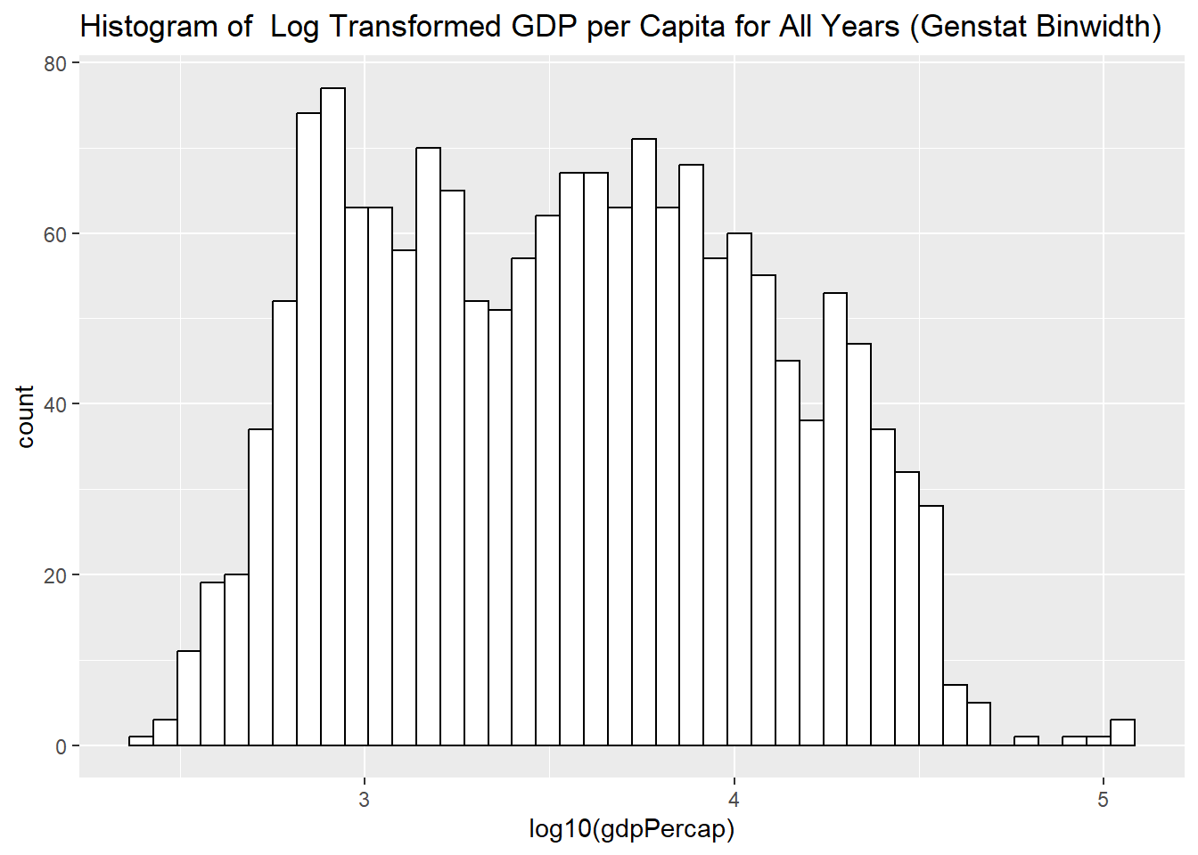 labs(title = "Histogram of Log Transformed GDP per Capita for All Years (Genstat Binwidth)")