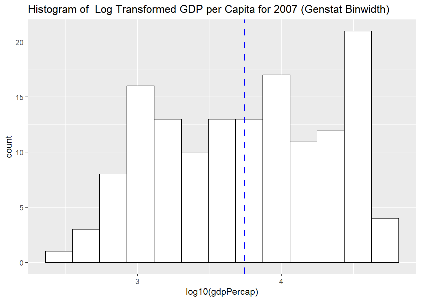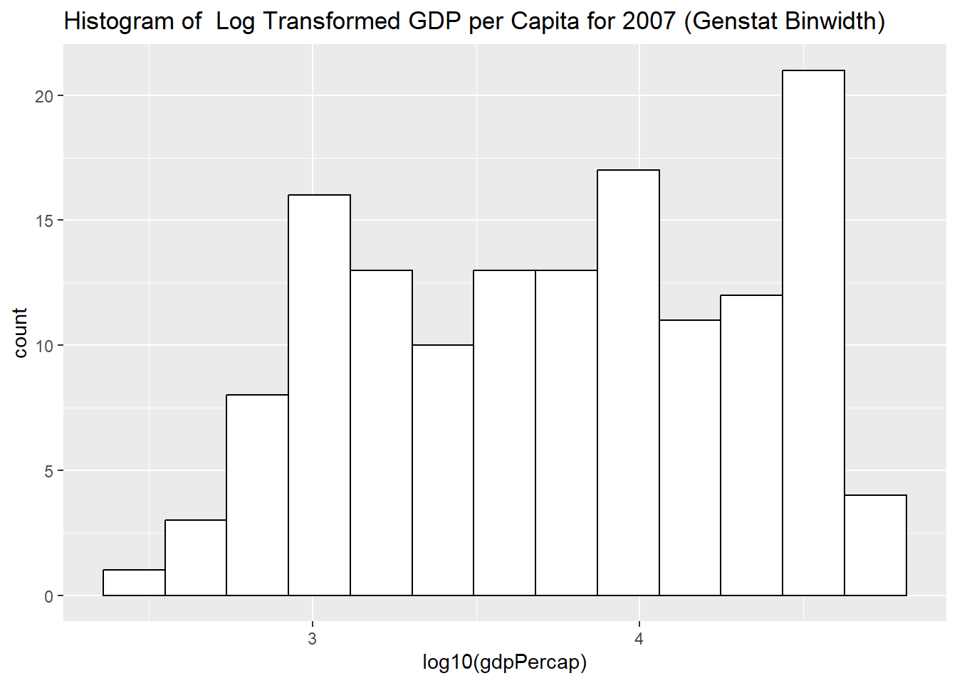 labs(title = "Histogram of Log Transformed GDP per Capita for 2007 (Genstat Binwidth)")