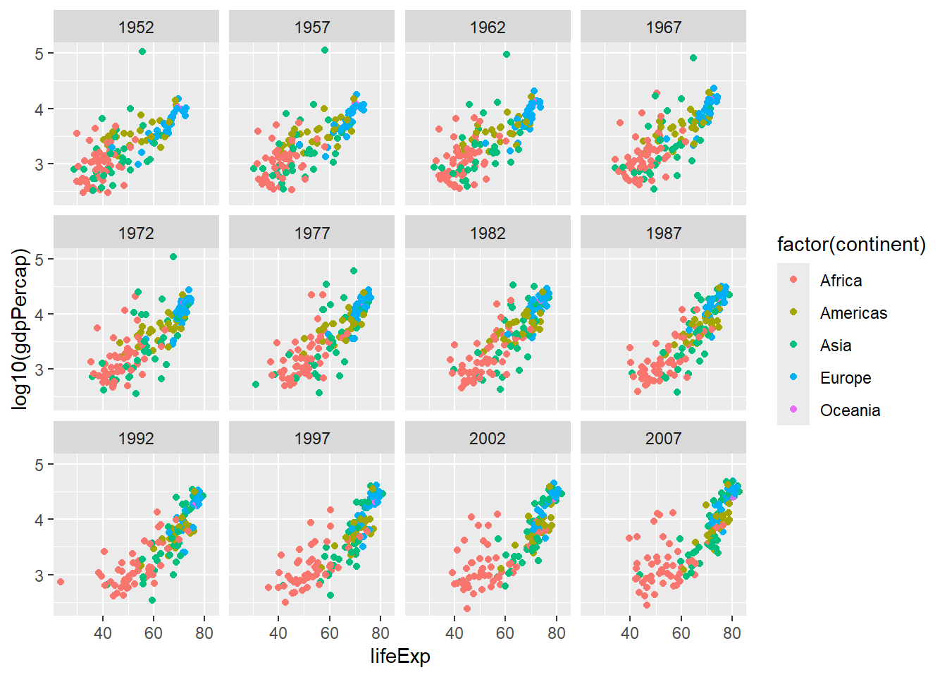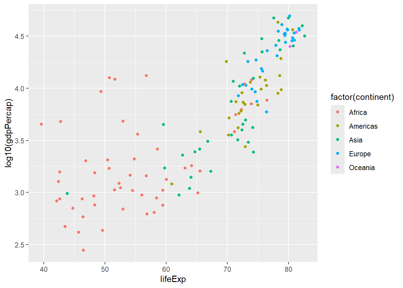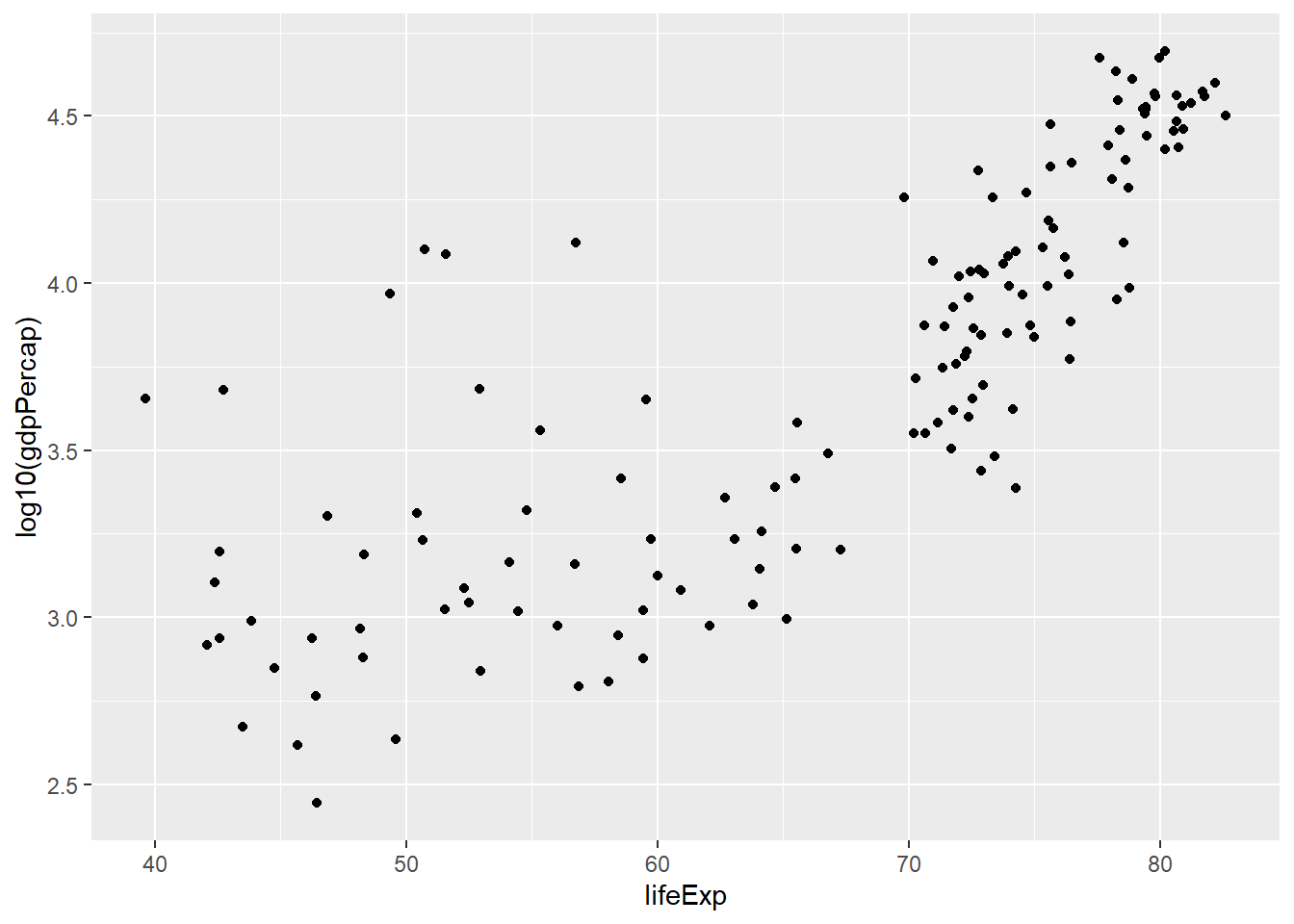 aes(x = lifeExp, y = log10(gdpPercap)))