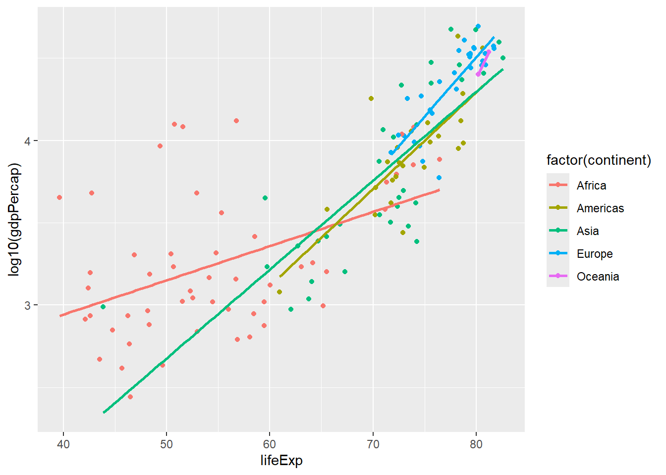 geom_smooth(aes(group = continent, colour = factor(continent)), lwd = 1, se = FALSE, method = "lm")`geom_smooth()` using formula = 'y ~ x'