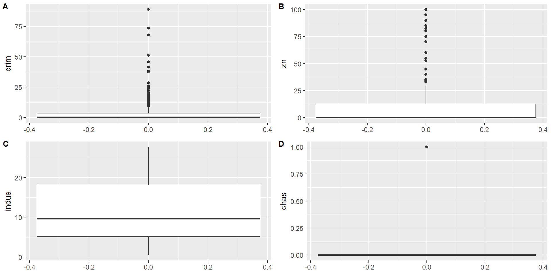 $ chas   : int  0 0 0 0 0 0 0 0 0 0 ...